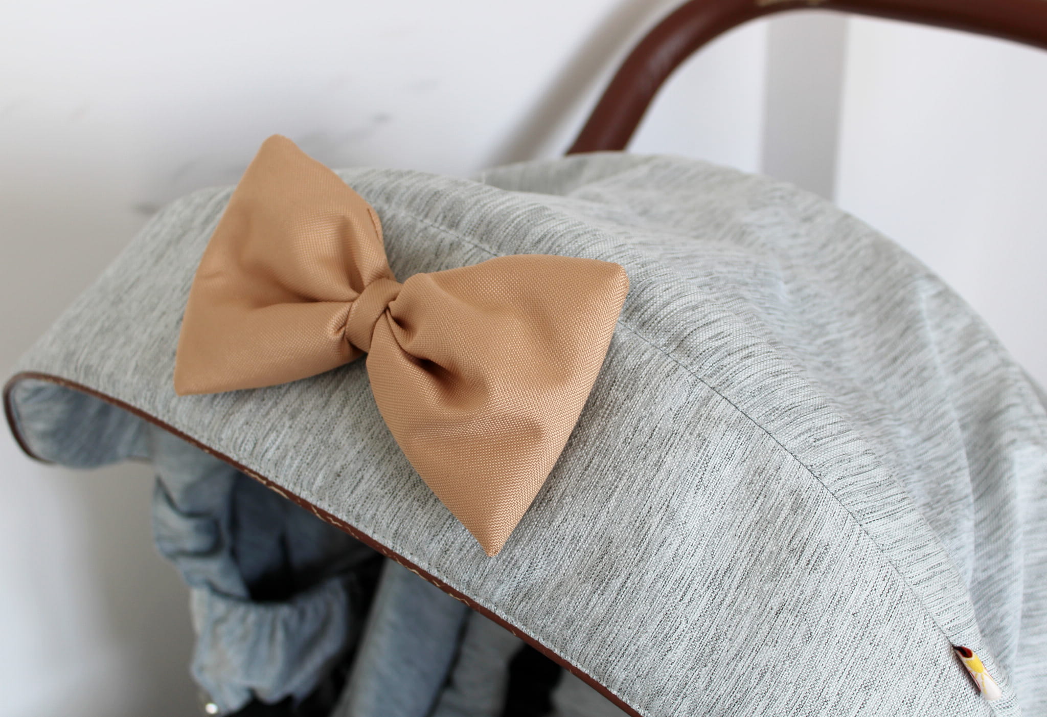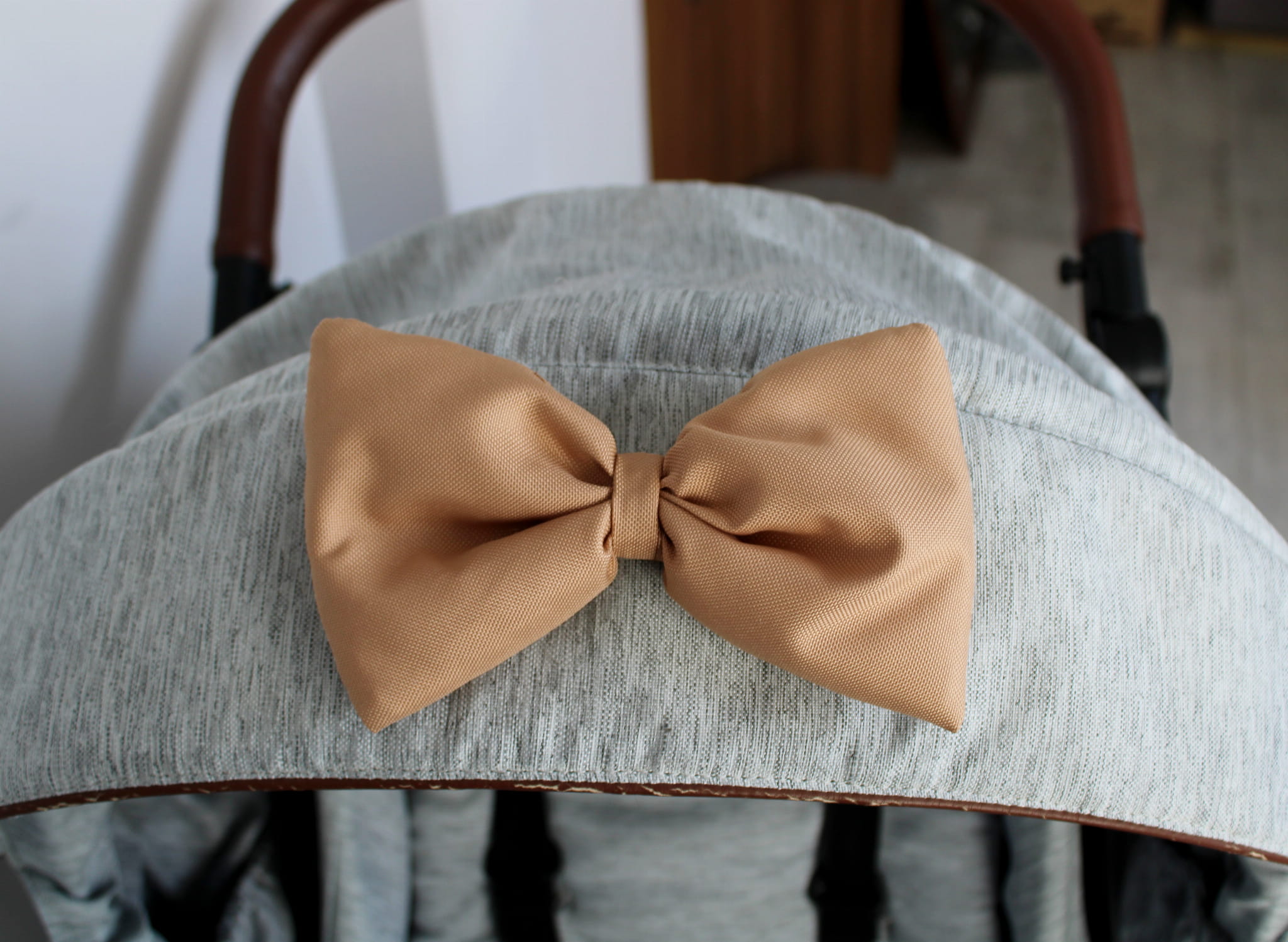 Urocza kokardka którą można przypiąć do wózka, np. do gondoli lub spacerówki. Wykonana z materiału wodoodpornego, dzięki czemu łatwo się nie brudzi, jest trwała i zachowuje piękny kolor. Do każdej kokardki dodajemy agrafkę, dzięki której można przypiąć kokardę do różnych materiałowych powierzchni, nie tylko do wózka. Pięknie prezentuje się także w łóżeczku, np. przypięta do ochraniacza lub baldachimu, czy np. do zasłonki w pokoiku dziecięcym.