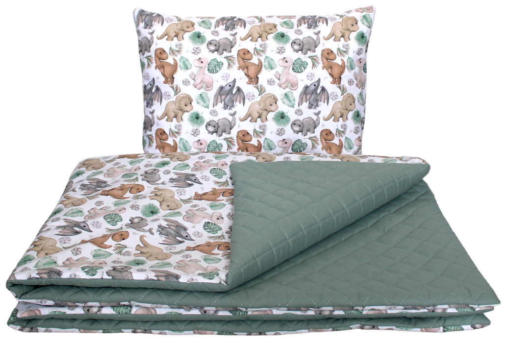 Komplet pościeli DINO 3 częściowy: dinozaury brązowo szare + pikowana szałwia (szarozielony)