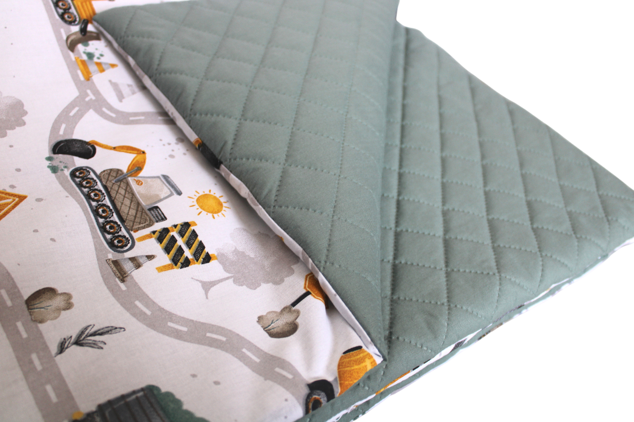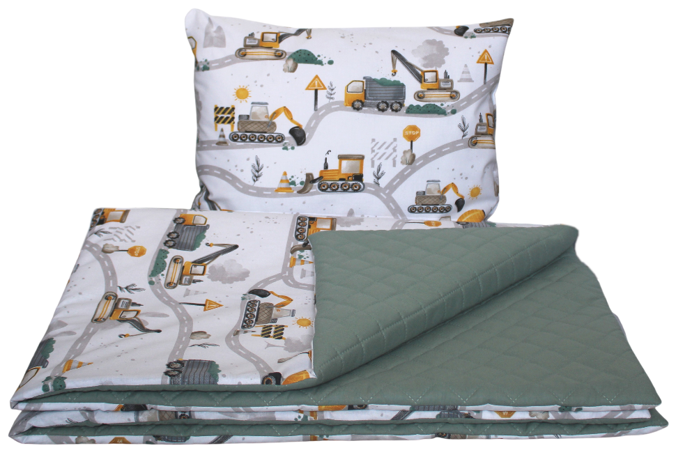 Komplet pościeli ROY 3 częściowy: plac budowy, koparki żółte + pikowana szałwia (szarozielony)