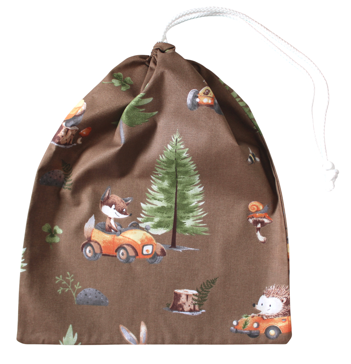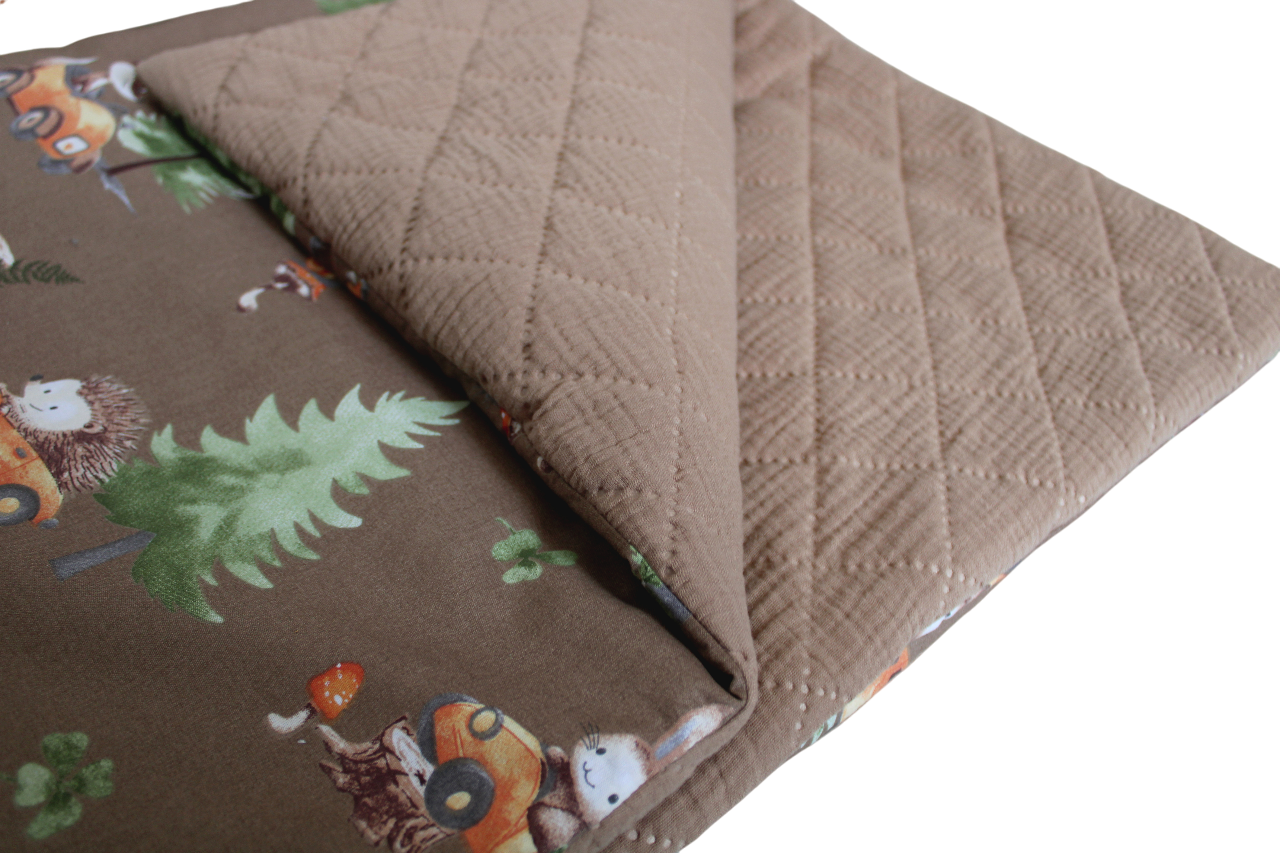 - cały zestaw z bezpiecznej dla dzieci 100% bawełny (kołderka z jednej strony bawełna we wzór, z drugiej pikowany jednokolorowy bawełniany muślin, poszewka i worki całe z bawełny we wzór)