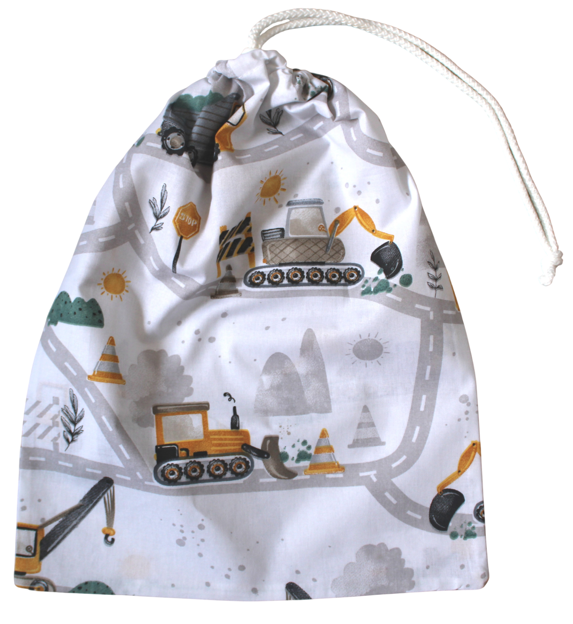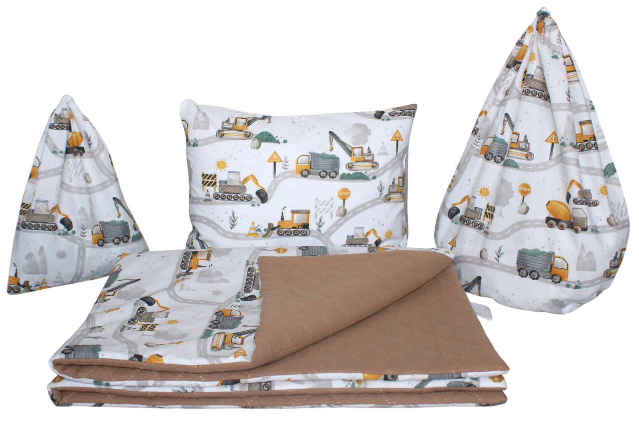 Muślinowy komplet przedszkolaka ROY CHOCO 5 częściowy: 100% bawełna plac budowy, koparki żółte + pikowany muślin karmelowy brąz