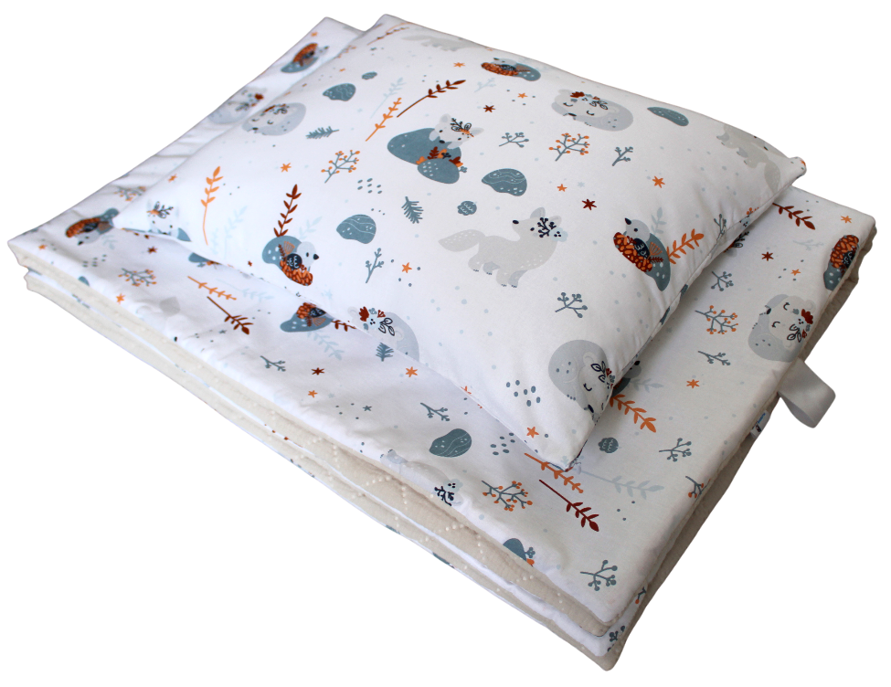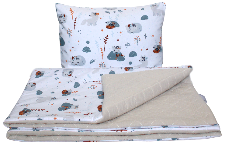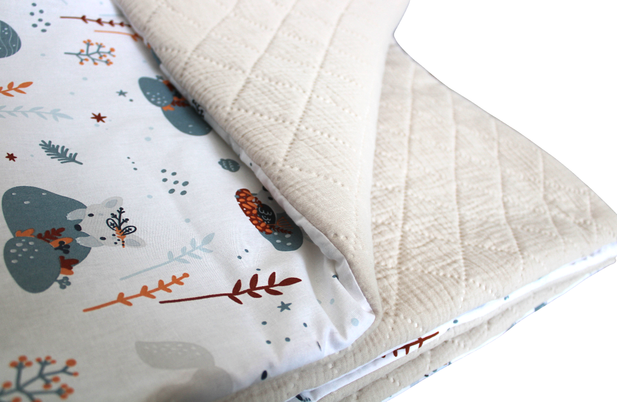 - cały zestaw z bezpiecznej dla dzieci 100% bawełny (kołderka z jednej strony bawełna we wzór, z drugiej pikowany jednokolorowy bawełniany muślin, poszewka cała z bawełny we wzór)
