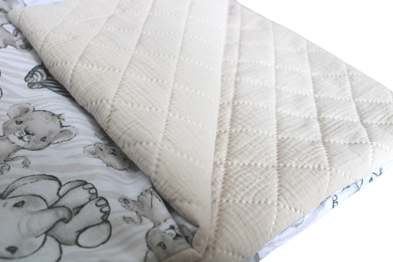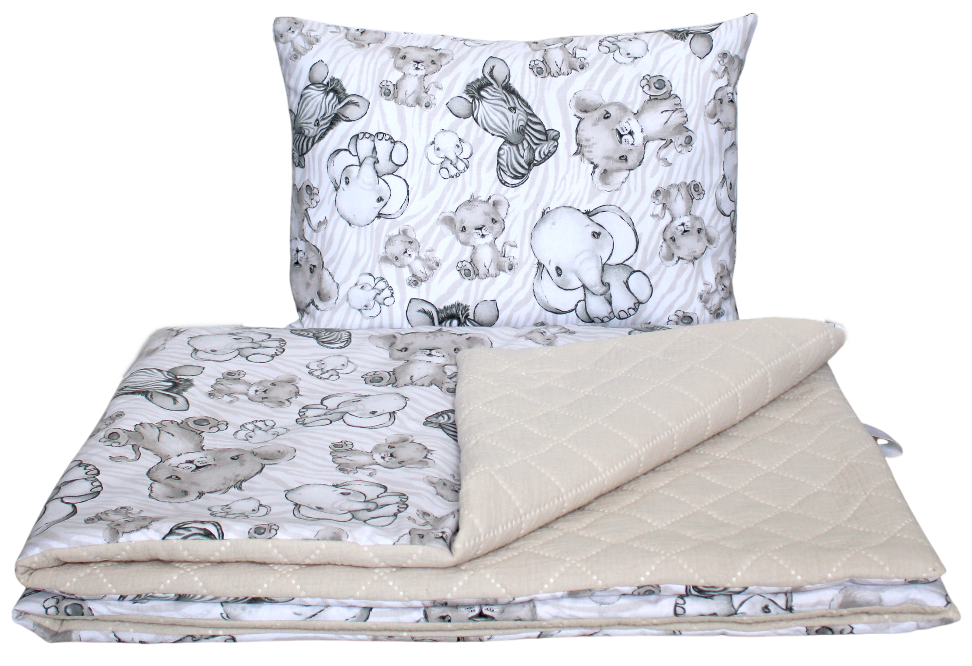 - cały zestaw z bezpiecznej dla dzieci 100% bawełny (kołderka z jednej strony bawełna we wzór, z drugiej pikowany jednokolorowy bawełniany muślin, poszewka cała z bawełny we wzór)